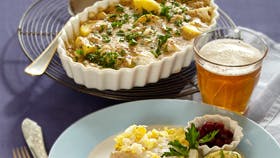 Bland torsk delt i mindre stykker og kartofler skåret i skiver i et smurt, ildfast fad. Hæld saucen over. Sæt fadet i ovnen ved 200° 12-15 min. Drys persillen over.