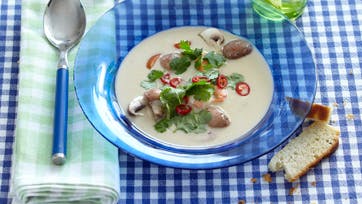 Pil rejerne og rist skallerne i olien ved kraftig varme sammen med hvidløg, peber, limeblade, hakket citrongræs og den ene chili i et par min. Hæld bouillonen i, lad suppebasen koge i 10 min. og hæld den igennem en sigte. Kog suppen op med kokosmælk, rejer, kvarte champignon og den sidste chili i ringe og smag suppen til med limesaft, sukker og fiskesovs. Tilsæt tomater i både og korianderblade og servér med et stykke godt brød.