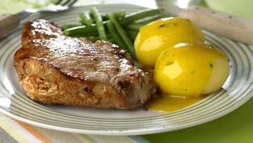 Fyldte svinekoteletter med kartofler og hvidløgssovs dertil.
