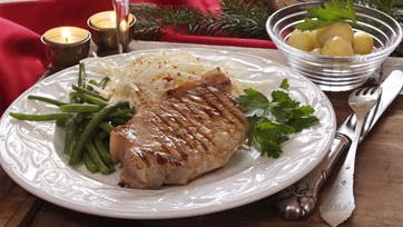 Skræl sellerien og skær den i helt tynde strimler (evt. på et køkkenjern). Giv dem straks et opkog i 30 sek. i saltet vand. Dræn dem og vend dem i yohgurt rørt med mayonnaise, sennep og hakket persille. Kog bønner i letsaltet vand i 6 min. og vend i citronsaft, salt, peber og olivenolie. Steg koteletterne på grillpande ca. 6 min. på hver side og server med sellerien og bønnerne. Server også kogte kartofler til.