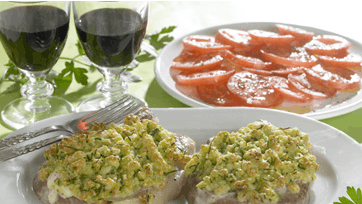 Bland brødkrumme, emmentaler, smør og det meste af purløget. Drys koteletterne med salt og peber og steg på grillpande ca. 3 min. på hver side. Smør dem med gedeosten og drys med brødkrummeblandingen. Stil dem i ovnen under grill i 5 min. til det er gyldent. Server med tomatsalat og evt. flute.