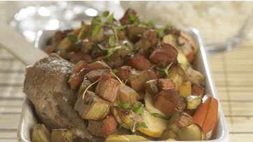 Krydr koteletterne med salt og peber, brun dem af ved høj varme og læg dem i et ovnfast fad. Skær løgene i kvarte og rabarberene i tern. Sauter løg, hvidløg og rabarber i olien, drys med sukkeret og lad det småsimre i 2-3 min. Skær æblet i tynde både og fjern kernehuset. Bland æblebåde og timian med løg og rabarber og fordel blandingen over koteletterne, tilsæt bouillonen og steg dem færdige i ovnen ved 200° i 20 min.