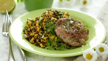 Skyl quinoakornene og kog dem i 2 dl vand i 15 min. Bland kødet med dild og mynte og form det til to krebinetter. Krydr med salt og peber, steg dem i smørret ved middelhøj varme 4-5 min på hver side. Skær agurk og mango i tern og bland dem med forårsløg og quinoa. Rør en dressing af olie, lime, salt og peber og hæld den over salaten. Pynt med hakket mynte.
