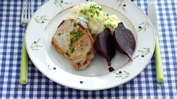 Kog rødbederne i letsaltet vand i 45 min. og gnid skallerne af. Pil hvidløgene, svits dem i olien og skræl kartoflerne. Skær kartoflerne i tern, kom dem ned til hvidløgene, hæld vand ved, så det dækker, og kog dem møre. Hak persille og forårsløg og bland det med osten. Skær en lomme i midten af koteletterne og fyld dem med blandingen. Krydr koteletterne med salt og peber og steg dem i smørret ved middelhøj varme 5-6 min. på hver side. Hæld vandet fra kartoflerne, mos dem med cremefraiche og smag mosen til med salt og peber. Servér koteletterne med mosen og de kogte rødbeder dryppet med balsamico.