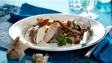 Tag skindet af kyllingefiléten, rids det med salt og steg det i ovnen ved 250° i 10 min. Pil og hak løg og hvidløg. Kom salvie på filéten og vikl skinke om kødet. Gnid kødet med olivenolie. Skru ovnen ned til 200° og lad kødet stege i 15 min. samtidig med, at skindet steger færdig. Rens svampene og skær dem i ensartede stykker. Steg dem i olie ved høj varme, til de er brune. Drys med salt og peber og kom løg og hvidløg ved. Lad det simre ca. 10 min. Smag blandingen til med piskefløde og tilsæt masser af hakket persille. Serveres til kødet, der skæres i skiver som en lille steg.