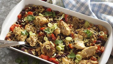 Kog risen i bouillonen i 9 min. og lad den trække 9 min. Skær kyllingen i mindre stykker og vend med krydderier. Varm olien i en stor pande eller wok og brun kyllingen i 5 min. Kom peberfrugter ved og steg i yderligere 5 min., før risen, bønnerne og korianderbladene tilsættes. Ved servering drysses med forårsløg og krydderurter.