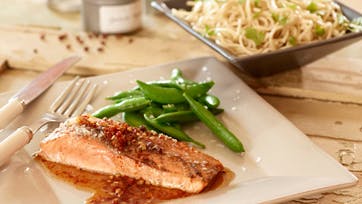 Start med sovsen. Kog sukker og eddike i 5 min., til det danner seje bobler. Kom chili og løg i og sluk. Lad sovsen trække. Knus Sichuan peber og bland den med fivespice krydderi. Gnid laksen med krydderierne og drys med salt. Steg laksen i sesamolie ca. 5 min på hver side. Blanchér ærterne i 30 sek. og kog nudlerne efter anvisning på pakken. Drys nudlerne med frisk koriander og server laksen med chilisovsen og sukkerærterne.