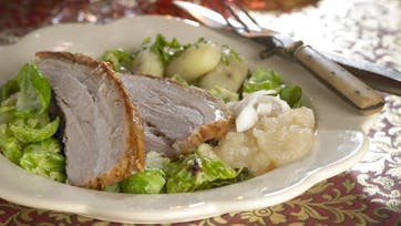 Krydret ribbensteg med æblekompot og rosenkål