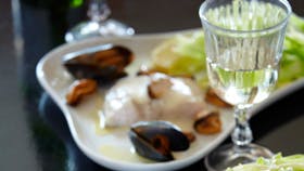 Skær filéten i fire stykker, læg dem i et ildfast fad og drys med salt og peber. Hæld ½ dl hvidvin over. Rens og sortér muslingerne. Pil og hak løget. Varm olien i en gryde og kom løg og muslinger ved. Hæld resten af hvidvinen over, når det syder godt, og lad det dampe under låg i 5 min. Smag retten til med salt og peber. Si lagen. Pil muslingerne ud af skallen. Snit kålen i strimler, gnid den med groft salt og marinér den i æbleeddike. Sæt fisken i en 220° varm ovn i 7 min. Tag den ud og læg muslingerne over. Bring muslingelagen i kog og blend den med smør, til det skummer. Hæld skyen over fisken og anret med den marinerede kål.
