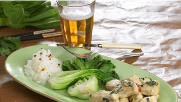 Hæld olie i en stor pande eller wok og steg karryen i 1 min. Skær kyllingen i store stykker og kom dem i panden i 2 min. Tilsæt kokosmælk og fishsauce og kog igennem ved svag varme i 10 min. Kog risen i 8 min. i bulderkogende vand med salt. Hæld vandet fra og lad det trække. Lige inden servering kommes chili og basilikum i kyllingepanden. Grønsagen dampes i kvarte i suppen. Serveres med suppen smagt til med soja og drysset med lidt chili.