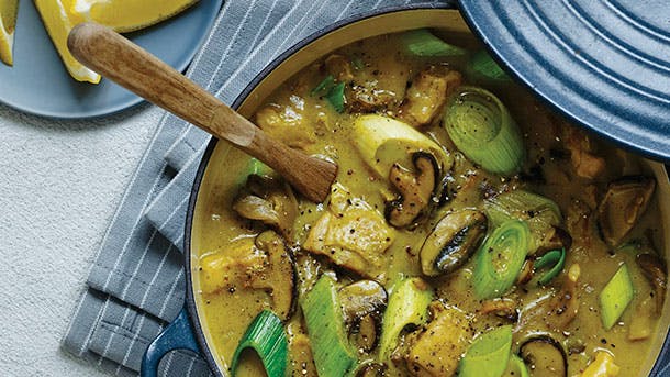 Læg kyllingekødet i saucen og lad retten simre i 40 min.