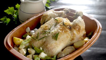 Gnid kyllingen med olivenolie, salt og peber og stil den i ovnen ved 250° i 10 min. Tag den ud og skru ned til 200°. Kom gulerødder, selleri, kartofler, hvidløg og perleløg i bunden af en stegeso og læg kyllingen over. Hæld vin og vand/suppe ved og læg kviste af romarin ved. Læg låget på og lad det braisere i 1½-1¾ time. Tag låget af og parter kyllingen og server med flute til at søbe al den gode suppe op med. Mættes med vand