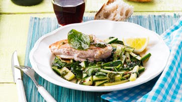Vend agurk, hakket purløg, pesto og spinat i sammen med citronsaft. Varm igennem. Kom lidt olie i en lille kasserolle og frituresteg blade af basilikum til pynt.