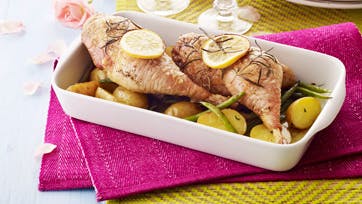 Brun kyllingestykkerne i olie i en meget varm pande. Læg så citronskiver på skindet sammen med salt og peber. Læg hakkede krydderurter og hvidløgsskiver under citronskiverne. Dryp lidt olie over og stil kyllingen i ovnen ved 210° i 35 min.