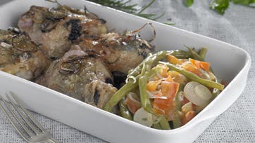 Lav lommer under skindet på kyllingestykkerne og smør olivenmassen ind under. Læg stykkerne i et ildfast fad og drys med skiver af løg og kviste af rosmarin. Hæld vin ved og drys med salt og peber. Sæt i ovnen ved 200° i 10 min. Rens kartofler og skær i kvarte. Tag fadet ud, løft kyllingerne op og læg kartoflerne under kyllingen. Skru ned til 170° og steg færdig i 35-40 min. Flå tomaterne, fjern indmaden og skær kødet i tern. Steg hakket løg og hvidløg i olie i en gryde, til de er bløde, og kom tomaterne ved. Tilsæt bønner, vand, sukker, salt og peber og bring i kog. Lad det småsimre i ca. 30 min. Spis til kyllingen - men kan også bare laves i større portioner og spises som koldt tilbehør - holdbart i 3 dage i køleskabet.