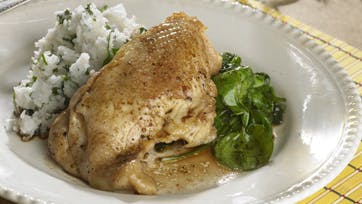 Kog risen med salt og vend med hakkede krydderurter til sidst. Steg kyllingestykkerne i olie ved høj varme i 5 min. på hver side. Kom soja ved og vend med spinat. Når det klasker, kommes æble i tern og nødder ved og det serveres med krydderurteris.