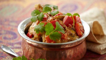 Pil og hak løgene, hak tomater og rens og hak peberfrugterne. Smelt smørret og sauter løg, tomater og peberfrugter. Tilsæt tikka masala-blanding og fløde og bring til kogepunktet. Kom kyllingestykkerne i og lad det små simre i 10-15 min. Tjek, at kødet er gennemstegt. Pynt med frisk koriander.