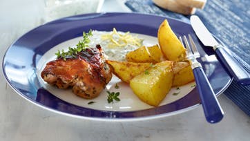 Rør soja med honning og timian, vend kyllingelårene i og fordel dem i et ovnfast fad. Skær kartoflerne i både, kom dem i en frysepose med olie, salt og karry og luk til. Ryst posen, så krydderierne fordeler sig jævnt, og kom dem på en bageplade med bagepapir. Bag dem sammen med kyllingen ved 200° i 45 min. Rør yoghurten med krydderurter, agurk, revet citronskal og -saft og smag til med salt og peber.