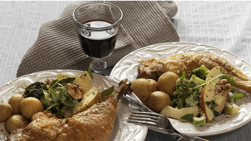 Dryp kyllingen med salt, peber og olie og stil den i ovnen ved 200 grader i 45 min. Kog kartoflerne i letsaltet vand i 20 min. Damp broccolien i buketter i lidt vand med salt i 2 min. Afkøl. Skær æbler i både og dryp med citron, skyl blegselleri og skær i skiver. Rør mayonnaise med dijon og lidt citronsaft og vend broccoli med blegselleri, æbler, og nødder og fold med rucola til sidst. Server med kartofler, der kan dyppes i den gode kyllingesky.