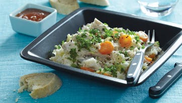 Hak løgene og skær gulerødder og porrer i skiver. Kom grønsagerne i den varme blanding af olie og smør og lad den sautere et par min. Tilsæt ris og bouillon og lad retten småsimre under låg i 12 min. Vend kylling og persille i, varm retten igennem og server med brød og en god chutney til.