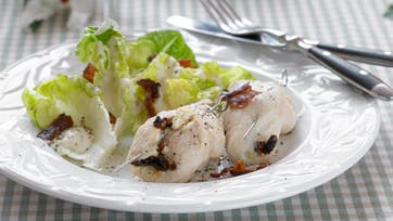 Skær fileterne igennem på langs, så der fremkommer 4 flade stykker af de to filetter. Rør salatost med hakket hvidløg og tomater og læg dette på hvert kødstykke. Rul som til benløse fugle og luk med kødnål. Drys med salt og peber. Steg bacon sprødt på pande.