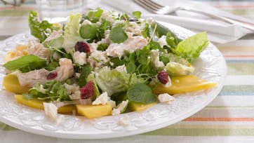 Bland mindre stykker kyllingekød med løg og citron, olivenolie rørt med sennep og citronskal. Kom de lune asparges op heri. Anret mango og salater på et fad og læg kyllingesalaten over. Drys med mynte og smuldret feta. Giv flutes til.
