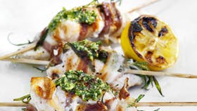 Læg spydene i koldt vand og tænd op i grillen. Drys kyllingefileterne med salt og peber. Skær fileterne i to stykker på langs. Læg en kvist rosmarin på hver og vikl bacon om. Stik spydene igennem 3 gange på hvert stykke kød og pensl med olivenolie. Steg på grillen med jævne rundvendinger i 12 min. med medium afstand til kullene. Læg halve citroner på grillen med skærefladen nedad. Blend persille, hvidløg, salt og peber med hasselnødder og så meget olivenolie, at det er en tyk grød. Smør dette på de nystegte spyd og server med citron.
