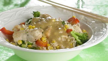 Begynd med sovsen. Varm olie i en gryde, kom løg i og smelt så peanutbutter heri. Tilsæt soja, citron og kokosmælk. Smag til og hold det lunt. Woksteg strimler af kyllingen i 2-3 min. Tag op og woksteg så ingefær, løg, rød peber og små stykker broccoli. Overhæld nudlerne med kogende vand og lad dem blive bløde. Dræn for vand og kom kylling, nudler og sovs i wokken til grønsagerne. Drys med koriander eller persille.