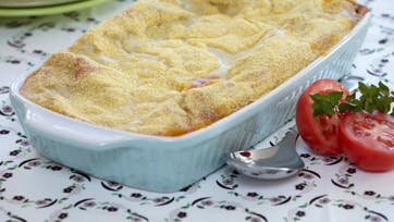 Svits kødet i olien sammen med det hakkede løg og hvidløg. Tilsæt flåede tomater, oregano, salt og peber og lad sovsen koge igennem. Varm ris- el. sojamælken op under omrøring og ryst mel og fløde sammen i en melryster. Rør meljævningen i mælken, kog sovsen igennem og smag til med salt, peber og muskat. Smør et ovnfast fad med olie og læg et lag lasagneplader i bunden. Læg et tyndt lag kødsovs oven på og sidst bechamelsovs. Læg lagene skiftevis, til det hele er brugt, og afslut med bechamelsovs. Drys lasagnen med majsgryn og bag den i ovnen ved 180° i 35-40 min.