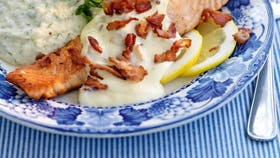 Servér fisken med blomkålsmos og pynt den færdige ret med persille, citronskiver og lidt ekstra sprødstegt bacon.