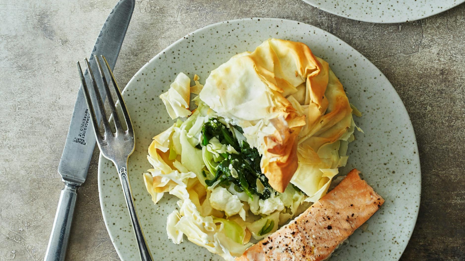 Servér den bagte laks med kogte kartofler og feta-spinat-pakker.