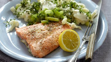Gnid laksen med revet citronskal, salt, peber og olivenolie og lad det trække, mens du laver salaten. Skyl bladsellerien og skær den i små stykker. Skræl agurken, flæk den, skrab kernerne ud og skær den i skiver. Del blomkålen i små buketter, hæld kogende vand over og lad det stå i ca. 5 min., inden vandet hældes fra. Bland blomkål, agurk og bladselleri i en skål med halvdelen af karsen. Rør skyr med mayonnaise, citronsaft, salt og peber og hæld det over grønsagerne. Pynt med resten af karsen. Stil laksen i en 225º varm ovn i ca. 6 min. Servér med citronbåde og flutes til.