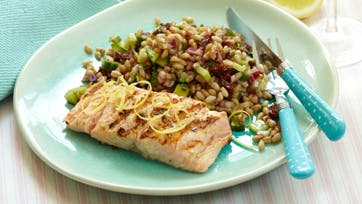 Kog perlespelten i vandet tilsat salt i 10 min. og lad den dryppe godt af. Halvér agurken på langs og fjern kernerne med en teske. Skær agurk, løg og tomater i små tern og bland dem i speltgrynene sammen med olie, balsamico og persille. Gnid laksebøfferne med saft og skal fra citronen og krydr med salt og peber. Grill laksebøfferne 3-4 min. på hver side og servér.