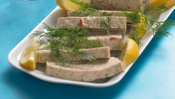 Flæk hummeren med en kniv og knus kløerne forsigtigt. Pil hummerkødet ud af skallen og sæt det til side. Skær fiskekødet i mindre stykker og miks dem hurtigt i en food processor sammen med æggehviderne, salt og de to slags peber. Stil farsen i køleskabet ½ times tid, så den er kold, inden fløden røres i. Smør 2 aflange forme på ca. 1 l med smør. Kom fars og hummerstykker lagvis i formen. Læg folie over og sæt formene i vandbad i ovnen ca. ¾ time ved 180°. Afkøl terrinen og sæt den i køleskabet til næste dag. Vend terrinen ud og skær den i skiver med en skarp kniv. Anret skiverne med citronbåde og dild. Terrinen kan laves med store, frosne hummere.