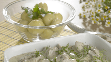 Kom kødet i en gryde. Hæld 1 l vand ad gangen over og tilsæt 2 tsk. groft salt pr. l. Når kødet er dækket, stoppes med vandet. Bring i kog og skum. Tilsæt urter og løg i både samt hele peberkorn. Lad kødet småkoge i ca. 2 timer. Si så kogelagen og lav en afbagning af smør, mel og kogelage. Smag til med citronsaft, dild, æggeblomme udrørt i fløde, salt og peber. Ved servering blandes masser af hakket dild i sovsen. Server med grønsager og kartofler.