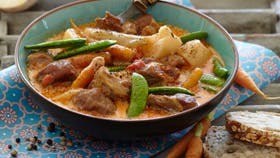 Grønsager: Pil løgene, skrab eller skræl gulerødderne og skær dem evt. i mindre stykker. Skræl majroerne og del dem. Kom grønsagerne i gryden og kog yderligere 10 min. Tilsæt ærter og kog 3-4 min. Hæld fløden i gryden og smag grønsagerne til med salt og peber.