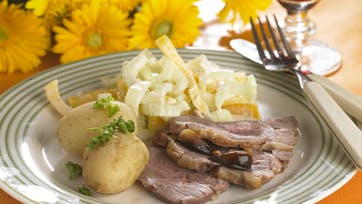 Rids lammeculotterne, krydr dem med salt og peber og læg dem i et ovnfast fad. Skær hvidløgsfeddene i skiver og læg dem over lammeculotterne. Steg lammeculotterne i ovnen ved 200° i 30 min. Skær bladselleri og peberfrugt i strimler og bland dem. Mos blåskimmelosten ud i cremefraichen med en gaffel til en let grynet dressing og smag til med tabasco, salt og peber. Hæld dressingen over grønsagerne og drys med de hakkede nødder. Server med nye kartofler.