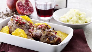 Drys lammeskankene med salt og peber og brun dem i pande på alle sider. Læg dem i et ovnfast fad. Steg krydderier i samme olie, tilsæt bouillon, appelsinskal og -saft og hæld det hele over lammeskankene. Stil dem i ovnen med alufolie over ved 160° i 2 timer. Kom så løg og fennikel ved og lad det fortsat simre dog uden folie i ca. 1 time. Kom skrællede, hele skiver af appelsin og granatæblekerner ved og giv det 5 min. mere.