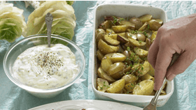 Bank bøfferne let og drys med kryddersalt. Lad dem trække køligt i 30 min. Kom løg i smalle både i en pande med både af tomat, både af æble, salt og peber og steg, til det bliver lidt fluffy i kanten. Kom grofthakket persille på og lidt vand og lad det simre i 10 min. Steg bøfferne på grillpande ca. 6 min på hver side. Rør tzatziki af yoghurt, hvidløg og groftrevet, drænet agurk og server med groft brød og et godt glas rødvin.