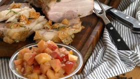 Snør stegen og læg den i et ovnfast fad, rids den grundigt i skindet og bland timian, salt, peber og fennikelfrø til en masse, der gnides i skindets riller. Brun stegen ved 240° i 30 min. Tag stegen ud, dæk med alufolie og stil den tilbage ved 120° i 5 timer. Lav så chutney ved at småkoge løg og chili i olien i en pande i 5 min., til de er bløde. Tilsæt æbletern, eddike og sukker samt ½ dl vand. Læg låg på og småkog i 20 min. Mos det igennem til en grov masse og kom timianblade ved. Alt dette kan man lave 2 dage før servering. Lav salat og sæt ovnen på 240° og giv stegen 30 min. ekstra, så skindet bliver sprødt.