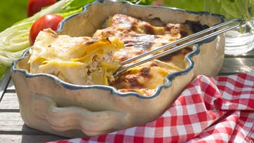 Dæk bunden af et smurt, ildfast fad med pastaplader. Dæk med et lag ricottablanding og ostesauce. Fortsæt skiftevis til alt er brugt. Slut med ostesauce og parmesan. Sæt fadet i ovnen ved 200° på midterrillen 20-25 min.