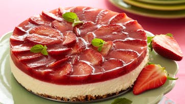 Gelé: Udblød husblassen, skær halvdelen af jordbærrene i skiver og fordel dem over kagen. Hak resten af bærrene, kog ud med Sukrin og vand og purér bærrene igennem en sigte. Tilsæt husblassen, rør, til den er opløst, og lad det køle lidt. Hæld jordbær-geléen over din cheesecake og stil den koldt, til geléen har sat sig.