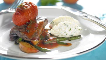 Gril leveren på en varm grillpande, den bør ikke gennemsteges. Krydres med salt og peber fra kværn. Rist 1 flået tomat på den samme pande og kog efterfølgende panden af med tomatsaften fra dåsen og lidt grofthakket persille.