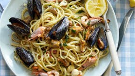 Lav en skøn pastaret med store rejer, kammuslinger og blåmuslinger