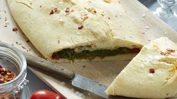 Pil og hak hvidløgene, steg dem i olie og tilsæt spinaten. Dræn og smag til med salt og peber. Del pizzadejen i 2 eller 3 boller, rul ud og smør tomatsovs på halvdelen af hver cirkel. Læg spinaten over og læg mozzarellaskiver øverst. Fold dejen over og tryk kanten sammen. Bag pizzaerne ved 225º i 25 min.