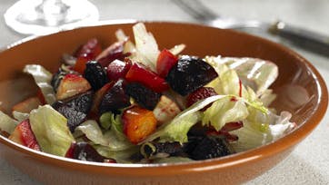 Skræl rødbeder, gulerødder, pastinak og rødløg og skær dem i lidt grove stykker. Smør en bradepande med lidt olie. Kom urterne i og bland dem med olie og salt. Sæt dem i ovnen 20 min. ved 200°. Skær æblerne i både og bland dem med grønsagerne. Sæt dem tilbage i ovnen 5 min. Bland dressingen og skær salaten i smalle både. Bland grønsager og salat. Hæld dressingen over og server med det samme.