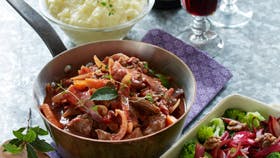 Skær kødet i tern på ca. 2 x 2 cm. Brun dem af et par gange i en tykbundet gryde i lidt af olien og tilsæt mere olie efter behov. Tag kødet op. Pil rødløg og hvidløg, skær rødløgene i tynde både og hvidløgene i tynde skiver. Kom dem i gryden og steg i 2 min. Sæt svampene i blød i 5 min. Kom kødet tilbage i gryden. Drys med mel og lad det trænge ind i kødet. Tilsæt de udblødte svampe, madeira, vand, flåede tomater med væde og tomatpuré. Riv og pres appelsinen og kom skal og saft i gryden. Tilsæt bouillonen. Skræl gulerødderne, skær dem i halve eller kvarte og kom dem i gryden sammen med timian og laurbær. Bring det hele i kog, skru ned og lad retten simre i 2 timer, til kødet er mørt, og smag evt. til med worchestersovs.