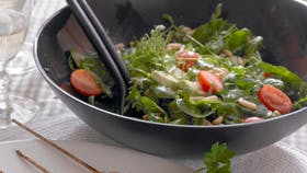 Skyl spinaten og læg den til afdrypning. Pluk persillen af stænglerne og skyl bladene. Pluk kørvelblade af og skyl efter behov. Skær skyllet bladselleri i små halvmåner, halver skyllede tomater på langs. Skræl og udsten avocadoer og skær i skiver, der dryppes med lidt citron. Rist pinjekernerne på en oliesmurt pande, til de er lysebrune. Vend det hele sammen og hæld olivenolie, salt og peber over lige inden, det skal serveres.