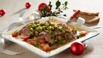 Pil rødløgene og skær dem i tynde skiver. Skær kødet i tynde skiver og læg dem i et halvdybt fad sammen med løgene. Pisk marinaden sammen og hæld den over kødskiverne.