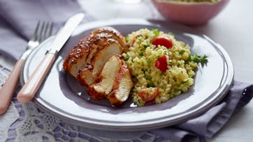 Bland harissa, honning, olivenolie, fintrevet limeskal, salt og peber og vend kyllingebrysterne deri. Lad dem trække i mindst 15 min. Kog bulguren i bouillonen i 8 min., pres saften af limefrugten og rør den i den lune bulgur sammen med olivenolie. Steg kyllingebrysterne ved middelhøj varme 8-10 min. på hver side, til de er netop gennemstegte. Halver tomaterne, hak krydderurterne og vend det i bulguren.